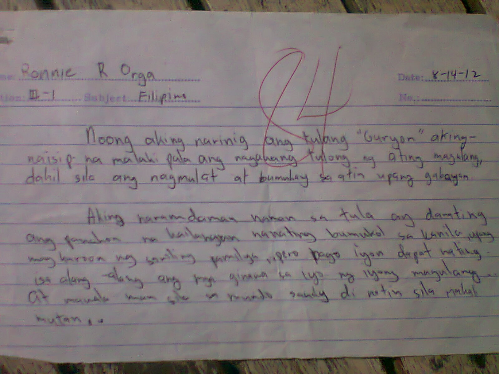 Umiyak ang batang babae. Napoot ang batang lalaki. Ibinalibag nito sa paanan na nanunudyong batang lalaki ang bitbit na mga aklat. Sinugod nito ang mga kalaban. Nagpagulong-gulong sila sa matigas na lupa, nagkadugu-dugo ang kanilang ilong, nagkalapak-lapak ang kanilang damit, hanggang sa dumating ang guro at sila’y inawat at sila’y pinabalik sa silid-aralan at pinadapa sa magkatabing desk at tumanggap ng tatlong matinding palo sa puwit.